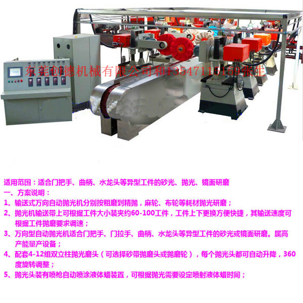輸送式式(shì)輸送工作(zuò)台上可根(gēn)據工件大(dà)小裝夾約(yue)💋40-100工件,工件(jiàn)上下更換(huàn)方便快捷(jié),其輸送速(sù)度可根據(jù)工件💜抛磨(mó)的要求調(diào)📧速,配套8-16組(zu)雙立柱抛(pao)光磨頭,也(ye)可根據🔱需(xū)要選裝龍(long)門式吊抛(pāo)式磨頭🆚。每(měi)個磨頭都(dou)可自動升(shēng)降前後,360度(dù)♈旋轉調整(zheng),360度任意角(jiao)度定位,且(qiě)旋轉及磨(mó)頭轉速都(dōu)可調♉速。磨(mó)頭裝有噴(pēn)槍自動噴(pēn)塗液體蠟(la)裝置,可根(gēn)據抛光需(xu)要設定噴(pen)射液體蠟(là)的時間,磨(mo)輪可實現(xiàn)恒定♈度自(zi)動補償功(gōng)能。