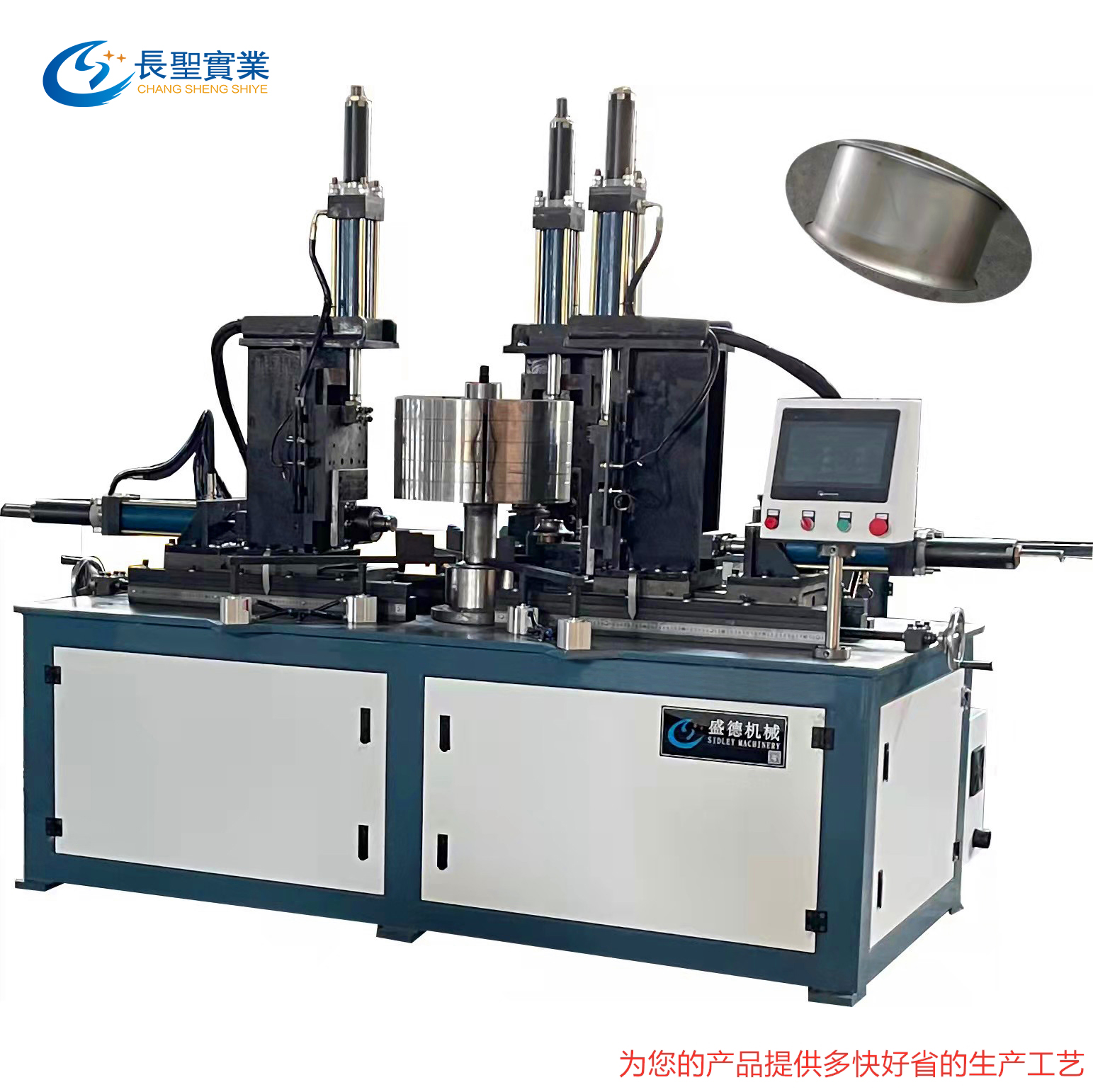 9. 設備(bèi)特點:可同(tóng)時多圓筒(tong)機型卷邊(bian),喇叭口成(cheng)型等功能(neng)。