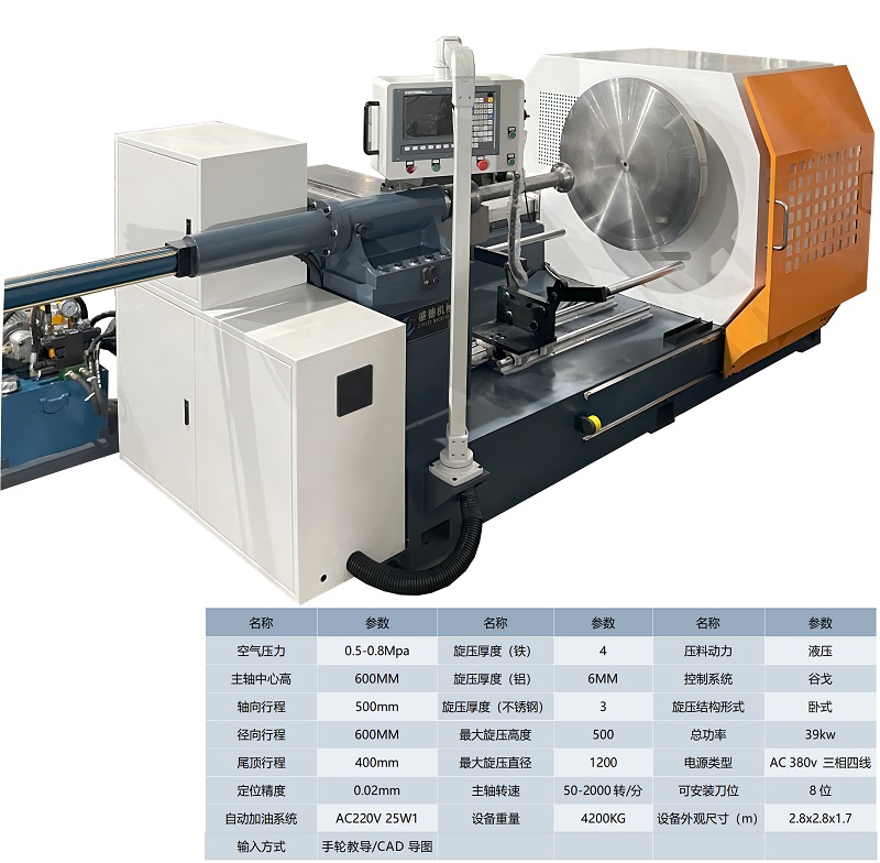 旋壓機參數:旋(xuan)壓直徑1200MM,旋壓厚(hòu)度鐵4mm 鋁6mm 不鏽鋼(gang)3mm,旋壓♋高度500mm,總👉功(gōng)率39kw